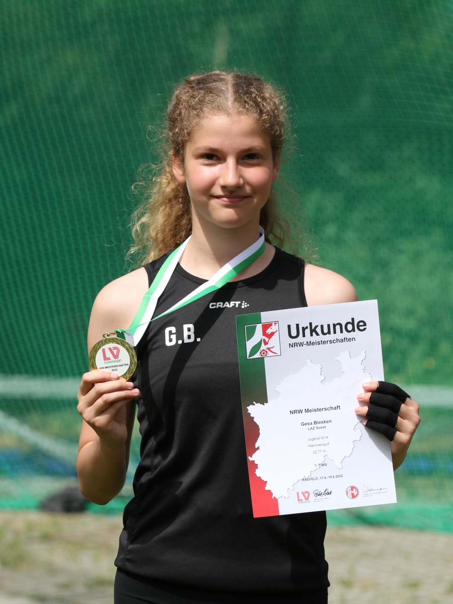 Maleen Romeo WU18, eine weiteres Talent aus der Soester Hammerwurfschmiede des LAZ, sicherte sich ebenfalls mit neuer persönlicher Bestleistung, den zweiten Platz bei den NRW Titelkämpfen. Die an Nummer eins gesetzte Werferin Maria Tsiante von Bayer 04 Leverkusen war für Maleen zu stark. Tsiante warf den Hammer auf 51,97 Meter und sicherte sich den Titel. Maleen Romeo lieferte aber trotzdem einen hervorragenden Wettkampf. Drei der sechs Versuche lagen über der alten Bestmarke. Auch Maleen erzielte ihre neue Bestweite von 39,50 Metern im dritten Versuch, wie zuvor Gesa Blesken. Die vierzig Meter waren an diesem Tag im Kopf noch zu weit weg. Diese Marke wird aber in einem der nächsten Wettkämpfe fallen, ist sich Trainer Ralf Reinhard sicher.