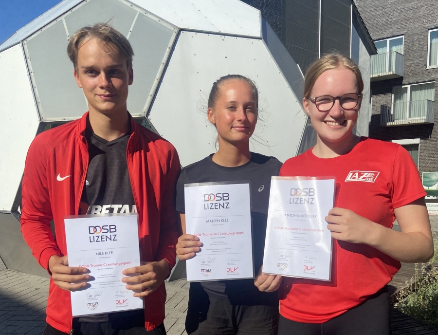 Das Trainerteam des Leichtathletikzentrums (LAZ) Soest bekommt Verstärkung. Antonia Böttiger, Maleen Klee und Nils Klee haben beim Fußball- und Leichtathletik-Verband Westfalen (FLVW) die Prüfung zur C-Trainer-Lizenz bestanden. Zuvor hat sich das Trio intensiv auf die Inhalte vorbereitet. In einer Online-Lernphase ging es zunächst um die theoretischen Grundlagen, anschließend stand eine einwöchige Praxisphase im Sportcentrum Kaiserau an.