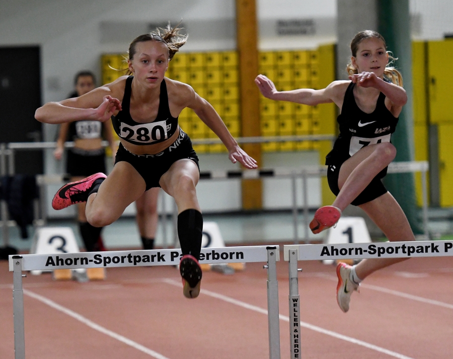 Über eine neue persönliche Bestleistung freute sich auch Mathilda Grienitz. Mit übersprungenen 1,50 Metern setzte sie sich im Hochsprung-Wettbewerb der Altersklasse W14 gegenüber ihrer höhengleichen Vereinskameradin Sophie Martin durch. Martin ist mit ihrer Bestmarke von 1,60 Metern aktuell die Nummer eins in Westfalen, hatte bei dem Wettkampf in Paderborn jedoch mit Anlaufproblemen zu kämpfen und wurde Zweite. Deutlich besser lief es für sie im 60-Meter-Hürdensprint. Hier kam Martin in neuer Hallenbestzeit von 9,68 Sekunden als Erste ins Ziel.