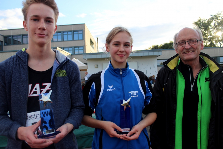 Seine späte Entscheidung für eine Teilnahme am Rüthener Flutlichtsportfest sollte Tim Bause nicht bereuen. Der U18-Sportler des LAZ Soest hatte sich kurzentschlossen erst unmittelbar vor Beginn der Veranstaltung noch für den 100-Meter-Sprint und den Hochsprung nachgemeldet und verzeichnete am Ende zwei Siege. Bei einem zulässigen Rückenwind von 1,0 Meter/Sekunde steigerte der 17-Jährige zunächst seine persönliche Bestzeit um fast eine halbe Sekunde auf 12,08 Sekunden und gewann hier ebenso wie im anschließenden Hochsprungwettbewerb, wo er 1,75 Meter meisterte. Obwohl Tim damit seinen Hausrekord von 1,88 Metern klar verfehlte, reichte diese Höhe dennoch aus, um sich den Pokal für die beste Einzelleistung aller männlichen Teilnehmer zu sichern.
