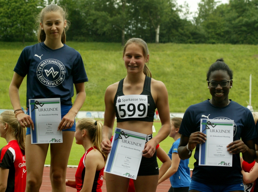 Dort verwies die 15-Jährige die Wattenscheiderin Mbenda Aaliyah (13,04), der sie sich im Vorlauf noch mit einem Rückstand von 15 Hundertstel geschlagen geben musste, auf den dritten Rang. Über eine neue persönliche Bestleistung konnte sich Maya im anschließenden Weitsprungwettbewerb freuen. Eine Steigerung auf 4,96 Metern bedeuteten für sie Platz fünf. Ebenfalls eine neue Bestmarke erzielte Mayas Vereinskameradin Maleen Klee (W15). Sie wurde mit 4,82 Metern Siebte.